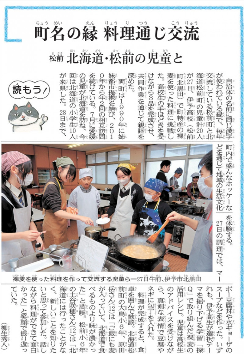 - 【探Q】はだか麦プロジェクト講座と、北海道松前町と愛媛県松前町の児童による調理体験の様子が愛媛新聞に掲載されました!