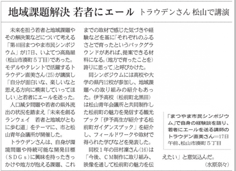 R06-1118 愛媛新聞6面 地域課題解決 若者にエール トラウデンさん松山で講演