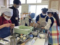 2024年1月10日 12時00分1月7日、松前町の姉妹都市である北海道松前(まつまえ)町とのふれあい交流事業の一環として、両町の児童が来校、松前の特産品であるはだか麦を使った調理体験を、本校食物教室で行いました。